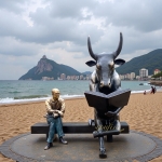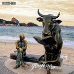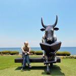 Very cute sitting bull statue. This bull is sitting on a long chair, studying and reading a book. And it is pointing at it with one hoof. The bull’s horns are u, and his lovely tail is on the chair. Next to this reading bull, a man is sitting. He is wearing a pair of glasses and is watching the bronze bull statue carefully.