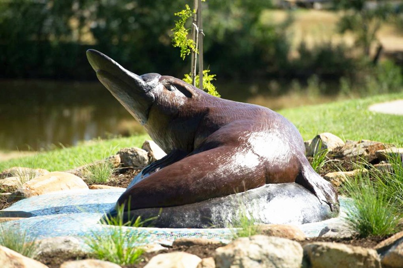 The statue depicts a medium-sized mammal with a sleek and streamlined body, covered in dense, waterproof fur. Its body is elongated and slightly flattened, giving it a streamlined appearance similar to that of a duck. The sculpture showcases the platypus’s characteristic webbed feet, which are perfect for swimming and diving.