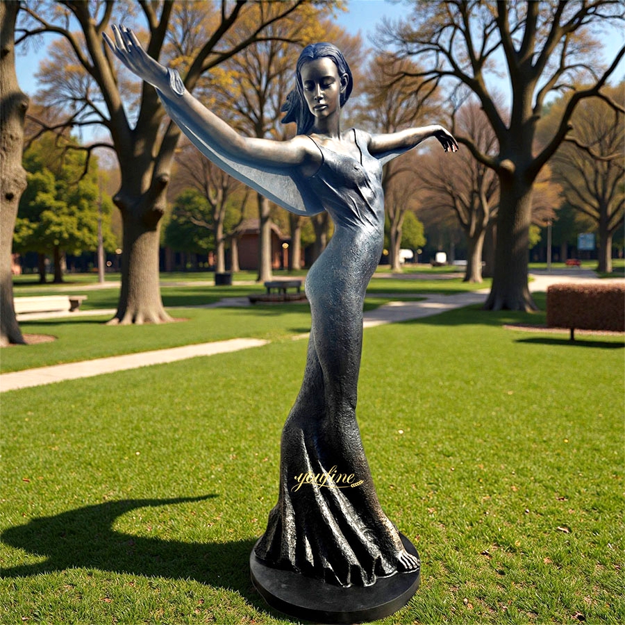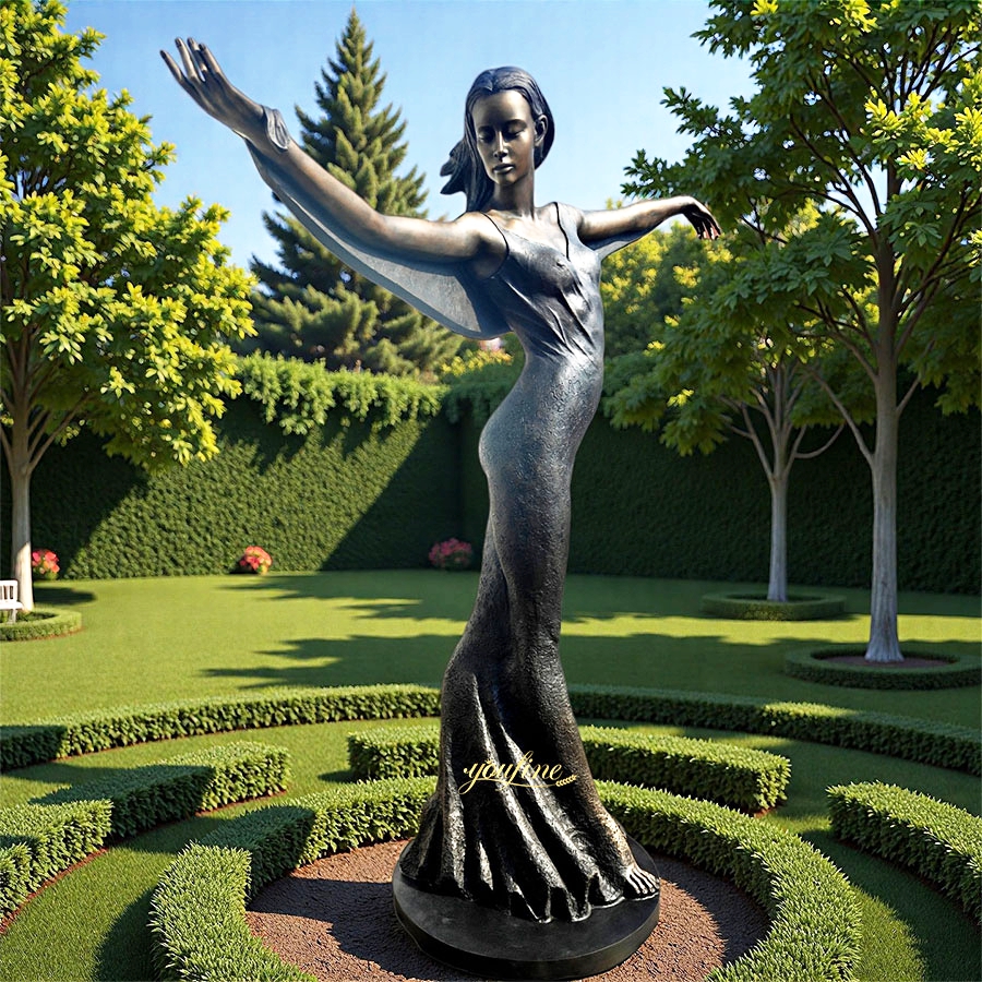 The bronze dancer sculpture is crafted from high-quality bronze, which is not only highly durable but also imparts a classic metallic quality. The meticulous finish creates a soft luster, making it suitable for indoor or outdoor display. Whether placed in a garden, patio, or art space, this sculpture will be a captivating focal point.