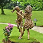 This bronze statue shows two girls holding hands and spinning around. The bronze girl statue comes to life. Sculpture can lock in moments of life. Nowadays, people live a fast-paced life, and such sculptures can evoke memories of childhood. If you too would like to add a sculpture like this to your surroundings, please contact YouFine.
