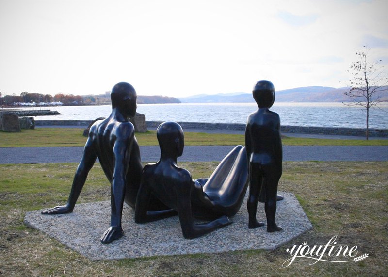 Their softened details bring to mind subtle aquatic forms — waves, ripples, reflections. So, they might find it in the Hudson River on a calm day. Then, the smooth surfaces transport the abstract bronze figures through a timeless doorway into another dimension inviting the viewer. And people would join them in a place of ease and contentment, forever observing the ebb and flow of the waters before us.