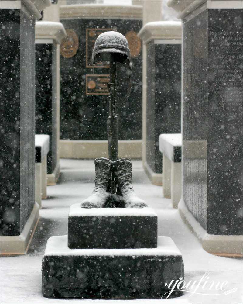 Battlefield Crosses originated during the American Civil War. The cross is made by holding the soldier’s boot upright, the rifle upright in the boot, and the helmet hanging from the rifle’s upright butt. If there are dog tags in the sculpture, those are usually dangling from the rifle.
