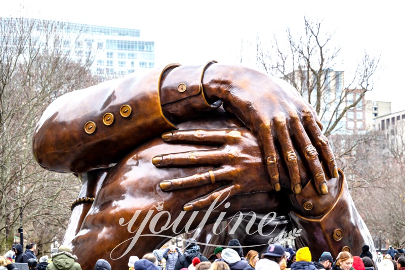 The new bronze MLK sculpture is located in Boston Common. This headless and bodyless bronze monumental sculpture was created by artist Hank Willis Thomas. Additionally, the sculpture was based on a photo of the couple embracing after Dr. King won the Nobel Peace Prize in 1964.